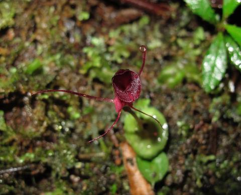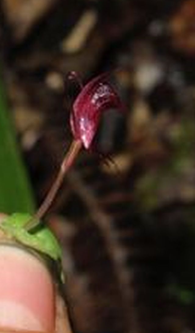 Found in Papua New Guinea on the Huon penninsula on mossy slopes in montane forests at elevations of 1500 to 1620 meters as a mini-miniature sized, cool growing terrestrial with a single,pale grayish green with pale veins and a broad whitish midrib above, suffused purple between veins beneath, sessile, ovate to elliptic, truncate to slightly cordate slightly decurrent on stem, glabrous, margin slightly undulate, revolute, apiculate, veins reticulate, with 2 lateral veins on either side of the midrib, outermost lateral veins extending most of the way to the apex leaves that blooms in the spring, summer and fall on an erect, purplish, .04" [1 mm] long, single flowered inflorescence with purplish, narrowly triangular, basally clapsing, keeled, subulate, twice longer than the ovary floral bract
