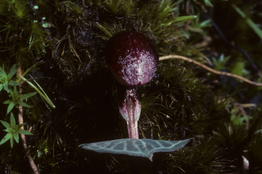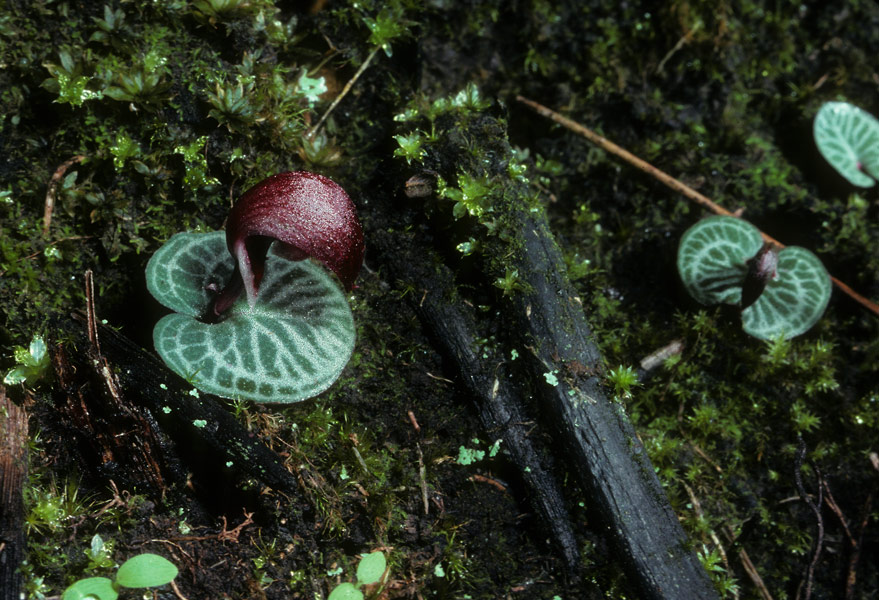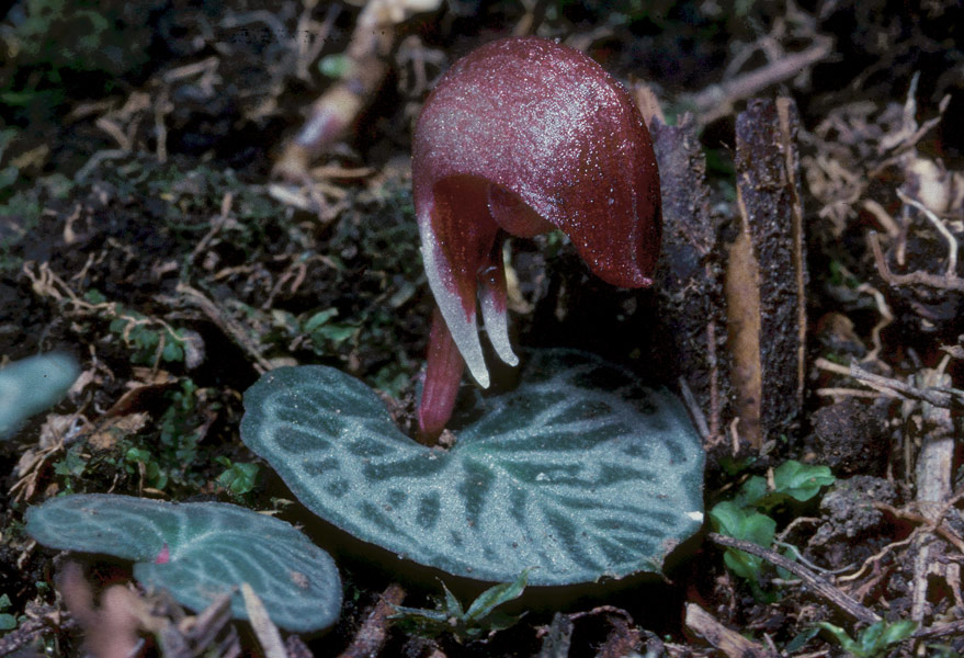 Found on east Java in montane grasslands, never in forests at elevations of 1280 to 1700 meters as a mini-miniature sized, cool growing terrestrial with a single, grey-green with broad silvery veining above and dark shiny crimson beneath leaf that is held close to the ground and blooms in the summer on an erect, short, single flowered inflorescence.