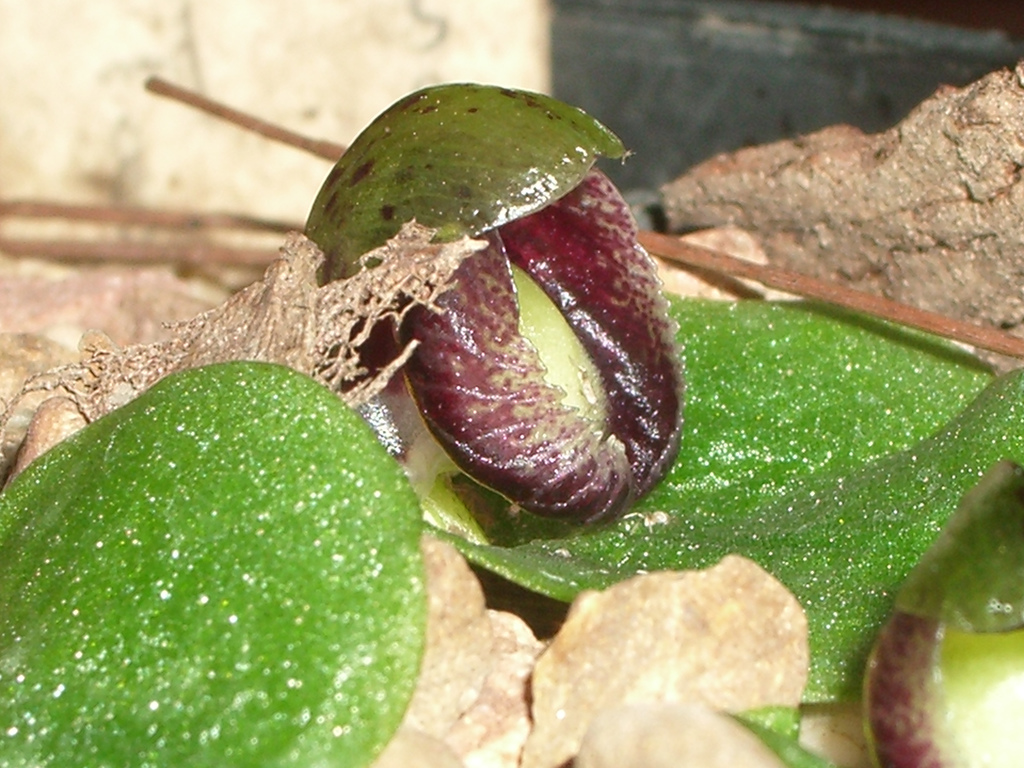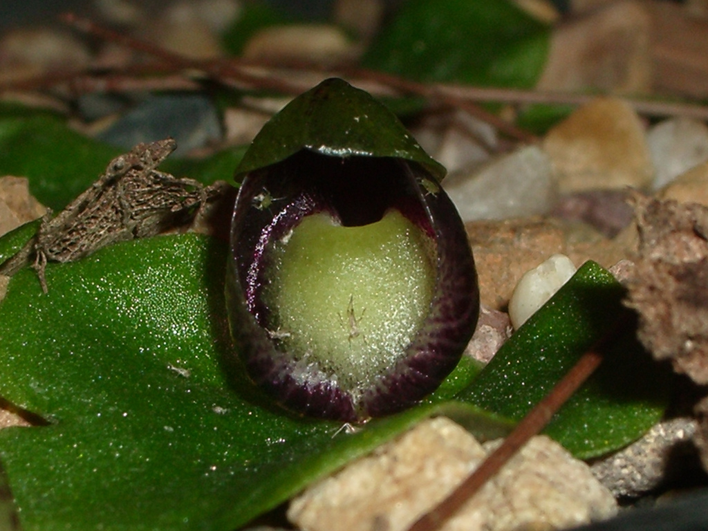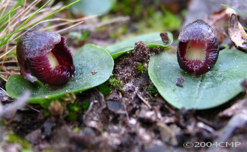 A rare, southeastern Australian, miniature sized, cold growing terrestrial species found in shady/sheltered sites in open forest with a single, ground-hugging, round leaf that is basally clasping to the inflorescence that blooms in the winter on a short, single flowered inflorescence.