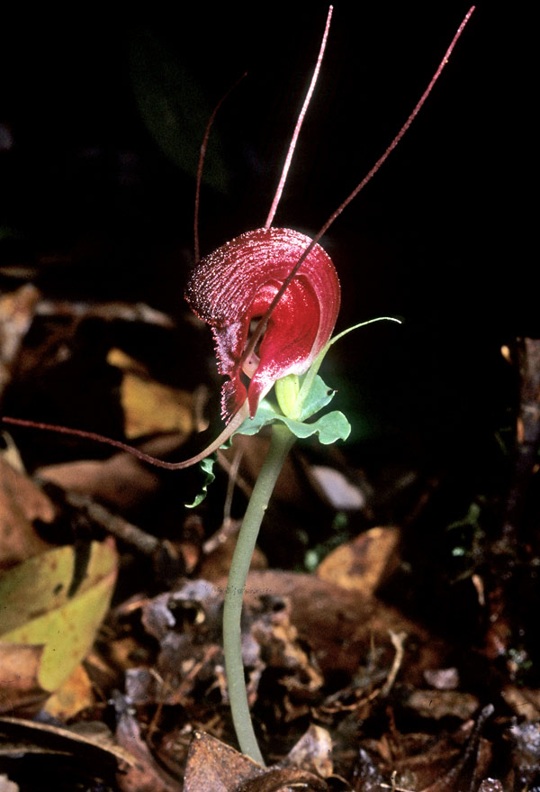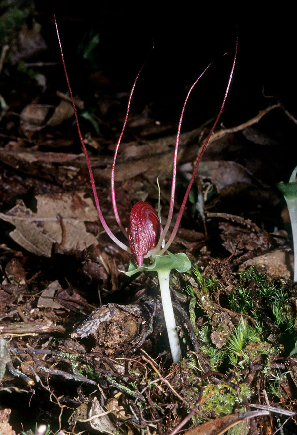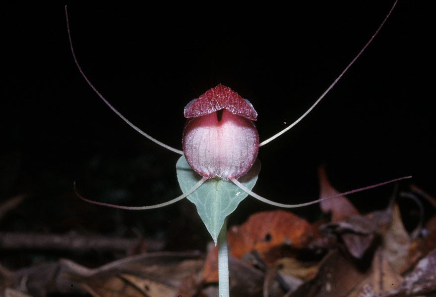 Found in Sumatra in montane forests at elevations of 1500 to 1600 meters as a mini-miniature sized, cool growing terrestrial with an ovoid tuber giving rise to an erect, angled stem enveloped by a triangular, basal sheath and carrying a single, sessile, horizontal, ovate-cordate, apiculate, basal lobes rounded and almost surronding the stem, undulate margined, veins slightly raised, dull bluish-green with paler veins above, shiny glaucous, gray-green beneath leaf which is held well above the ground and blooms in the spring on a short, single flowered inflorescence with erect, transluscent floral bracts