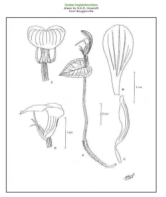Corybas longipedunculatus P.Royen 1983 Drawing by © N H S Howcroft and The Papua New Guinea Orchid News Website