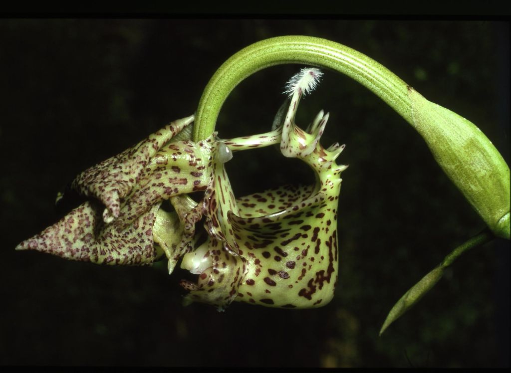 Found in southern Venezuela and northern Brazil in wet forests at elevations of 1000 to 1500 meters as a small sized, cool growing epiphyte with narrowly ovoid, deeply grooved pseudobulbs carrying 2, apical, erect, plicate, sulcate, carinate, lanceolate, acute, gradually narrowing below into the attenuate, petiolate base leaves that blooms on an erect, terete, dark, 10.4" [26 cm] long, single flowered inflorescence with 3 fairly conspicuous, tubular, close fitting bracts and carrying a very fragrant flower.