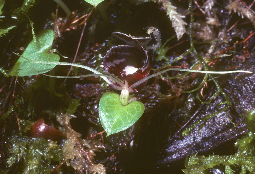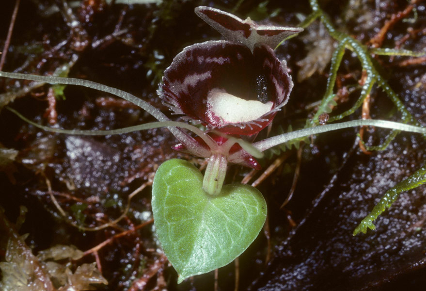 Found in Selangor Malaysia in mossy, ridge top forests at elevations around 1300 meters as a mini-miniature sized, cool growing terrestrial with a heart-shaped, more or less flat, dark green with very fine white veins and crystal bundles, acuminate leaf that blooms in the winter on an erect, single flowered inflorescence