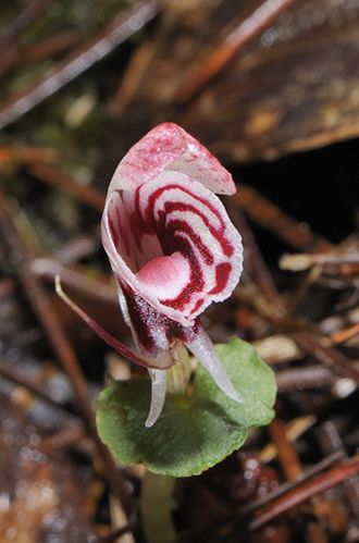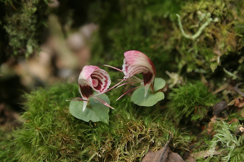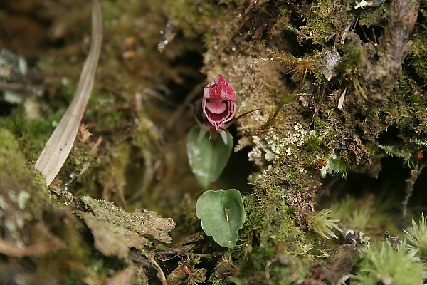 Found in western Sichuan and western Yunnan states of China and Taiwan in forests on rock outcrops or along valleys on mossy rocks at elevations of 1500 to 2600 meters as a mini-miniature sized, cool to cold growing terrestrial or lithophyte with a subglobose to ovoid tuber giving rise to an erect, pilose, subterranean stem with a single short cataphyl at the base and a solitary, near the apex of the stem, sessile, cordate, reticulate venation, acute apically leaf that blooms in the later summer on a short, single flowered inflorescence with a lanceolate floral bract