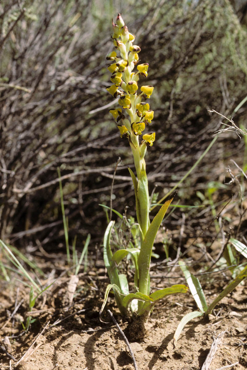 Found in western southwestern Cape Province South Africa in mature veldt at elevations of 760 to 1960 meters as a small sized, cold growing terrestrial with a fairly robust, leafy stem carrying numerous, lanceolate, broad based, mostly sheathing leaves that often are not present at blooming occuring in the spring on a terminal, erect, to 3.2" [8 cm] long, fairly lax to densely 6 to many flowered inflorescence with broadly ovate, acute floral bracts and pungently scented flowers.