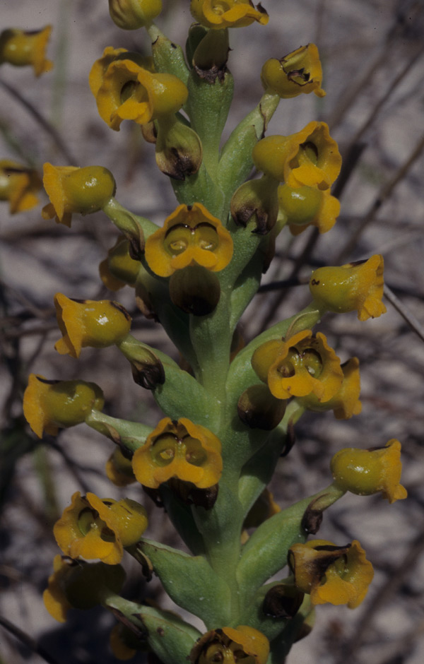 Common Name The Curled Corycium [refers to the undulate margined leaves] - In South Africa The Pigsnout Orchid - The Yellow False Trewwa [Geel bastertrewwa]