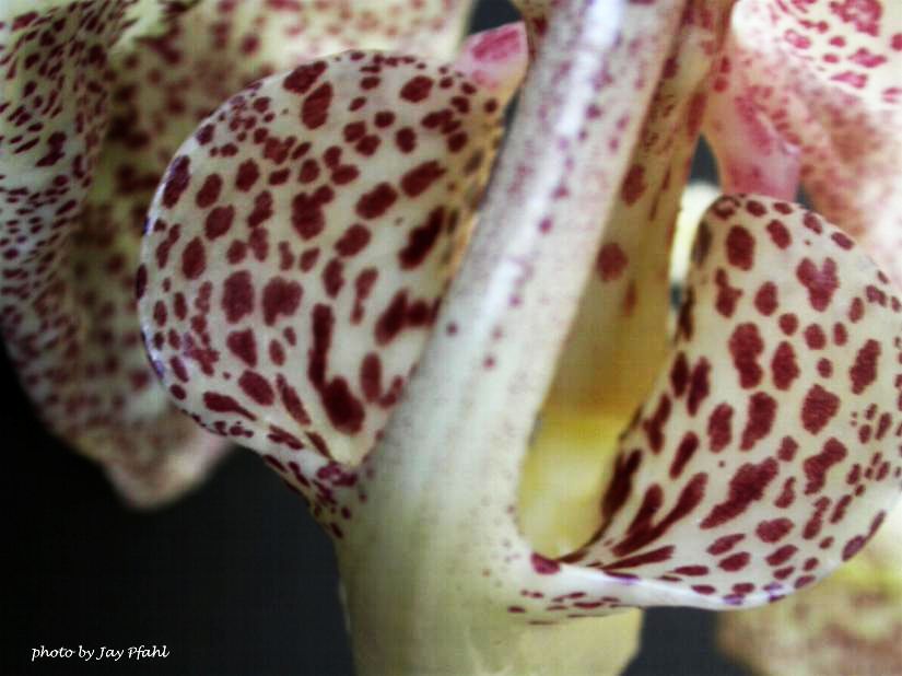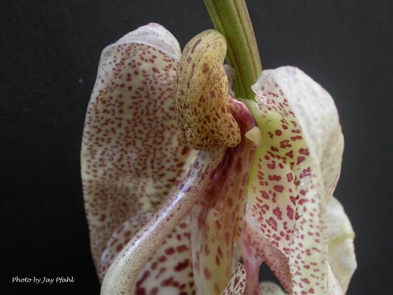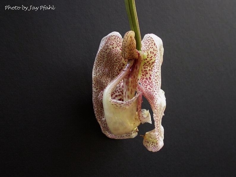 Found in Peru with ribbed, conical pseudobulbs carrying 2 apical, plicate, narrowly elliptical leaves that blooms in the summer in the northern hemisphere on a basal, lateral and then pendant, to 12" [to 30 cm] 1 to 2 flowered inflorescence arising on a mature pseudobulb and often after leaf-fall and carrying scented flowers.