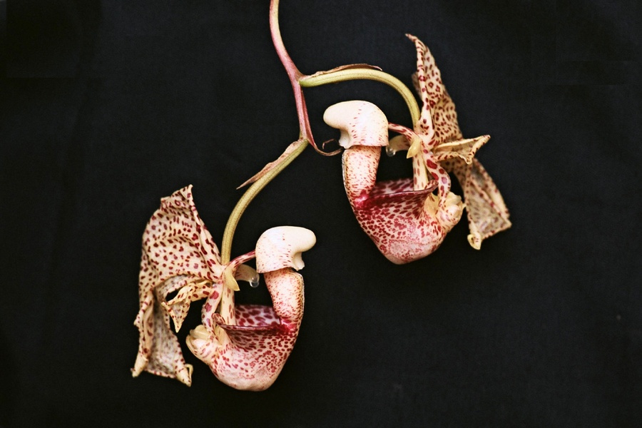 Found in Roirama State of Brazil at elevations around 1700 meters as a medium sized, cool growing epiphyte with clustered, elongate-ovoid, apicvally compressed, deeply many sulcate pseudobulbs carrying 2, apical, lanceolate, plicate, narrowing below into the pseudopetiolate base leaves that blooms in the mid spring through mid summer on a basal, pendent, stout, 10" [25 cm] long, 2 flowered inflorescence enveloped partially by a lanceolate, acuminate bract and carrying fragrant flowers.
