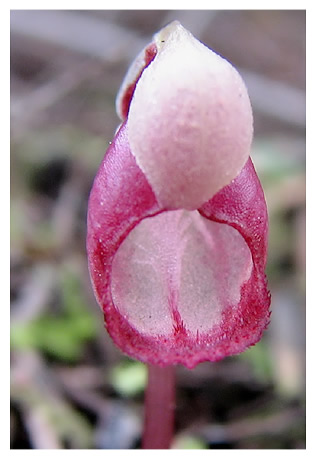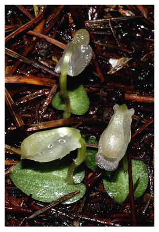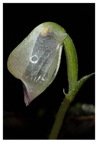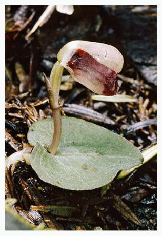 Found in the north island of New Zealand in pine forests as a mini-miniature sized, cold growing terrestrial with a single, oblong-oval leaf that blooms in the late fall on an erect, .8 to 2" [2 to 5 cm] long, single flowered inflorescence