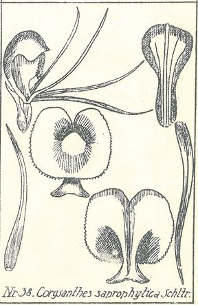Corybas saprophyticus (Schltr.) Schltr. 1923 SECTION Geosiphon Type Drawing by © Schlechter and The Swiss Orchid Foundation at the Jany Renz Herbaria Website