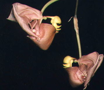Found in northern Peru around 100 to 1000 meters in elevation as a medium sized, hot to warm growing epiphyte with narrowly pyriform-cylindric, ribbed pseudobulbs carrying 3, apical, plicate, narrowly elliptic-lanceolate, acuminate leaves gradually narrowing below into the long slender, channeled petiole that blooms in the summer on a lightly arcuate then pendant, to 13" [33 cm] long, 1 to 2 flowered inflorescence arising on a mature pseudobulb and carrying 6 small, tubular, mostly remote sheaths and carrying heavily scented flowers.