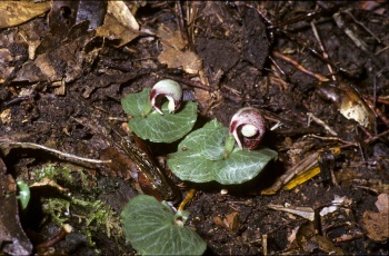 Found in Java in leaf litter and humus in primary forests at elevations of 1000 to 2300 meters as a mini-miniature sized, cool to cold growing terrestrial with a single, cordate, apiculate, usually undulate margins, bright green above with faint veining, green below, held well above the ground [diagnostic], petiolate base leaf that blooms in the spring on a single flowered inflorescence