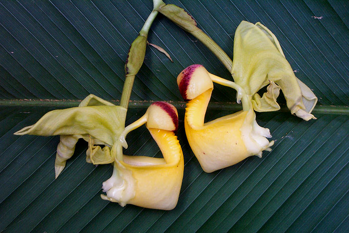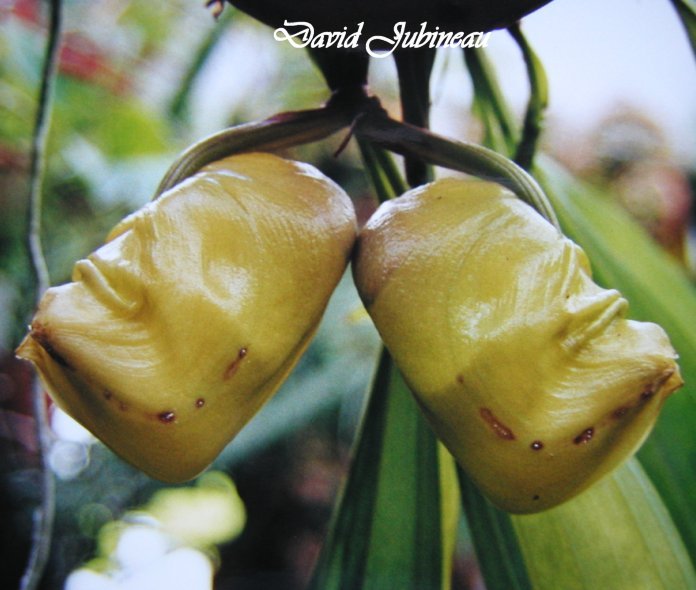 Found in Peru in lowland tropical rainforests at lower elevations as a large sized, hot to warm growing epiphyte with ovate, sulcate pseudobulbs carrying 2 to 3, plicate, narrow, strongly nerved beneath leaves that blooms in the summer till early fall on a pendant, 1 to 4 flowered inflorescence carrying fragrant flowers