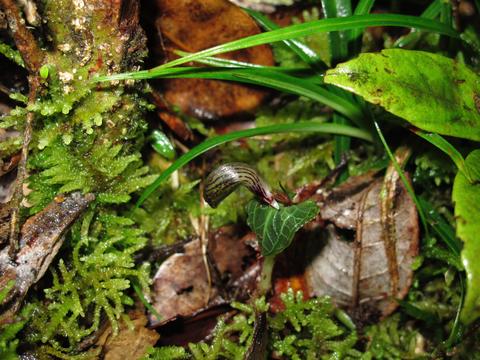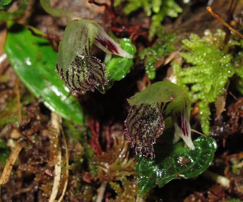 Found in Papua New Guinea in the western central mountains in mossy montane forests at elevations of 2300 to 2900 meters as a mini-miniature sized, cold growing terrestrial with an ovoid tuberoid giving rise to a slightly angular stem with a basal, subulate apically sheath and carrying a single, deep green with paler veins above, purple patches between veins beneath, sessile, cordate, slightly rugose, glabrous, margin undulate, apiculate, veins reticulate, with 2 lateral veins on either side of the midrib, outermost lateral veins extending 3/4's of the way to the apex leaves that blooms in the spring, on an erect, greenish, less than .04" [1 mm] long, single flowered inflorescence with green, narrowly triangular, acute, longer than the ovary floral bract