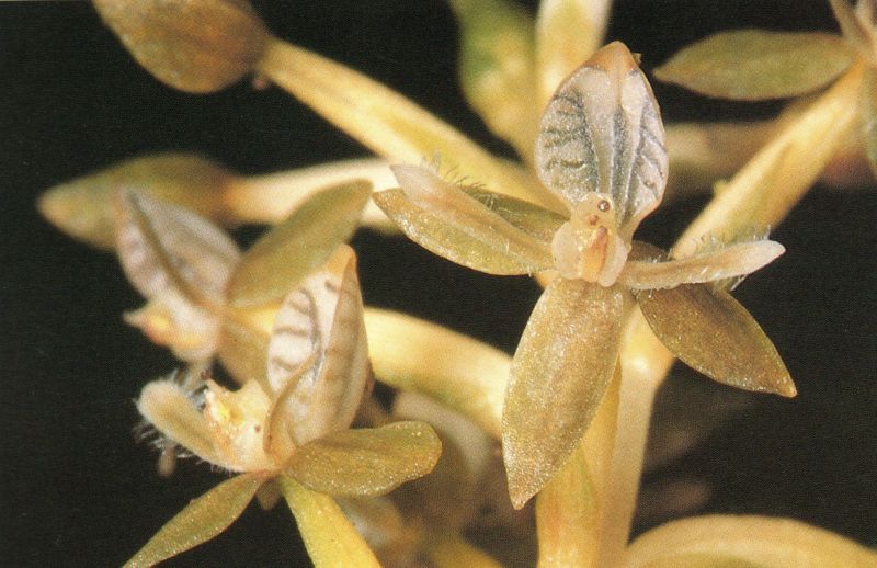 Found in Ecuador on the eastern coast at elevations up to 800 metersas a small sized, hot to warm growing terrestrial with 1 to 2, basal, ovate-elliptic, acute, more or less rounded below intothe short petiolate base leaves that blooms in the late summer and early fall on an erect, terminal, peduncle remotely 3 sheathed, to 8" [20 cm] long, rachis to 2" [5 cm] long, dense, many flowered inflorescence with triangular, acuminate floral bracts.