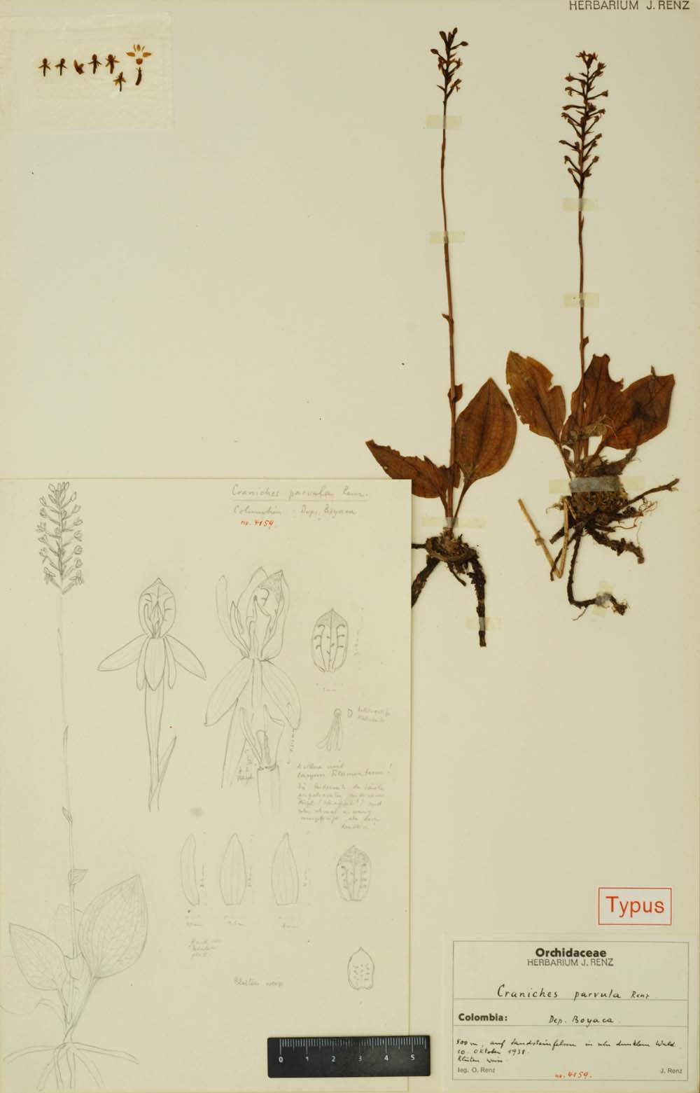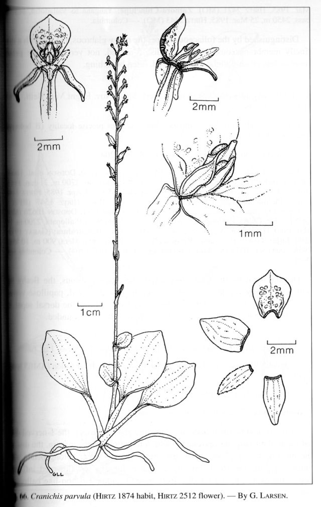 Found in Colombia and Ecuador in forests on banks at elevations around 500 meters as a small sized, hot to warm growing terrestrial with several, basal, ovate to ovate-elliptic, acute, rounded below into the canaliculate, petiolate base leaves that blooms in the fall on a terminal, erect, 2.4" [6 cm] long overall, loosely many flowered, racemose inflorescence with remotely several, leaf-like sheaths and lanceolate to ovate-lanceolate, acuminate, floral bracts.