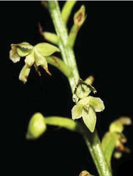 Found in Colombia and Ecuador in forests on banks at elevations around 2000 meters as a small sized, cold growing terrestrial with several, basal, ovate, acute, rounded below into the canaliculate petiolate base leaves that blooms on an erect, slender, peduncle few sheathed, to 11" [27.5 cm] long, rachis short to 2.4" [6 cm] long, loosely few flowered inflorescence.