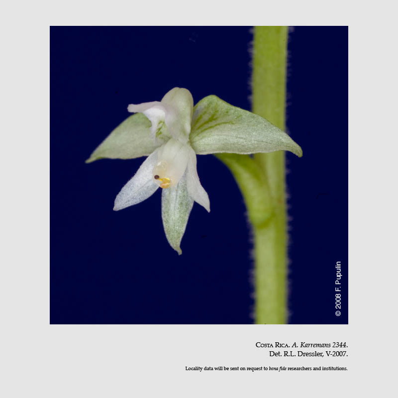 Found in Costa Rica at elevations around 1400 to 2000 meters as a small sized, cool growing terrestrial with 9 or more, basal, spreading, membranaceous, petiolate base leaves that blooms in the summer on a glandular-pubescent above the middle, 1.4" [3.5 cm] long, 10 to 15 flowered, racemose inflorescence.