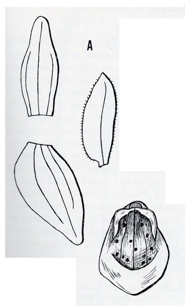 Distinguished by the foliaceous, heavily bracteate peduncle, the glabrous ovary, the thin, distinctly membraneous margin lip, the 3 nerved, sparsely papillose-verrucose disc, the acute to subacuminae, minutely ciliolate margin, more or less obliquely elliptic, single nerved petals the 3 nerved dorsal sepal.
