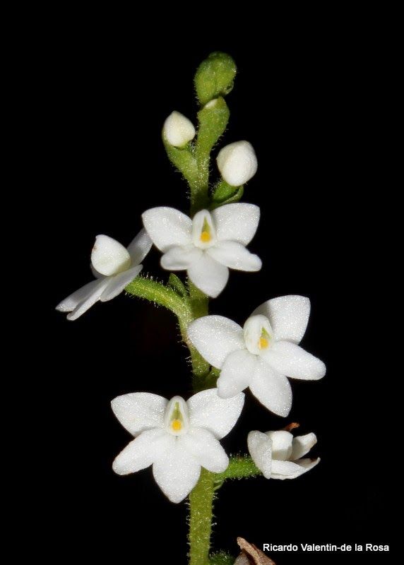Found in Cuba, the Dominican Republic and Puerto Rico in soils of moist scrub forests at elevations of 650 to 800 meters as a mini-miniature to miniature sized, warm growing terrestrial with a basal rosette of orbicular-oblong to oblong, more or less acute, cuneate below into the petiolate base leaves that blooms in the summer and fall on a terminal, erect, thin, 16" [40 cm] long, few to many flowered inflorescence carrying non-resupinate flowers.
