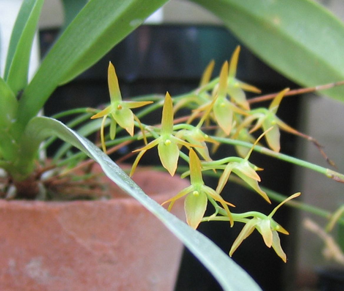 Found in Ivory Coast, Cameroon and Sao Tome in humid montane forests at elevations of 600 to 2100 meters as an erect, small sized, warm to cool growing epiphyte with an erect to horizontal stem carrying 2 ranked, conduplicate, linear-oblanceolate, unequally bilobed apically leaves that bloms in the spring on an axillary to basal, spreading, 3.6 to 6" [9 to 15 cm] long, 7 to 12 flowered inflorescence with oval, acute floral bracts.