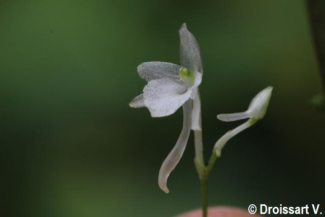 Found in Tanzania in montane forests at elevations of 2000 to 2100 meters as a miniature sized, cold growing epiphyte with an erect stem carrying 5, in 2 rows towards the apex of the stem, conduplicate, linear-oblanceolate, unequally and bluntly bilobed leaves that blooms in the winter on an axillary or basal, spreading, 4 to 5.2" [10 to 13 cm] long, 6 to 10 flowered inflorescence with oval, acute bracts and .4" [1 cm] between each flower.