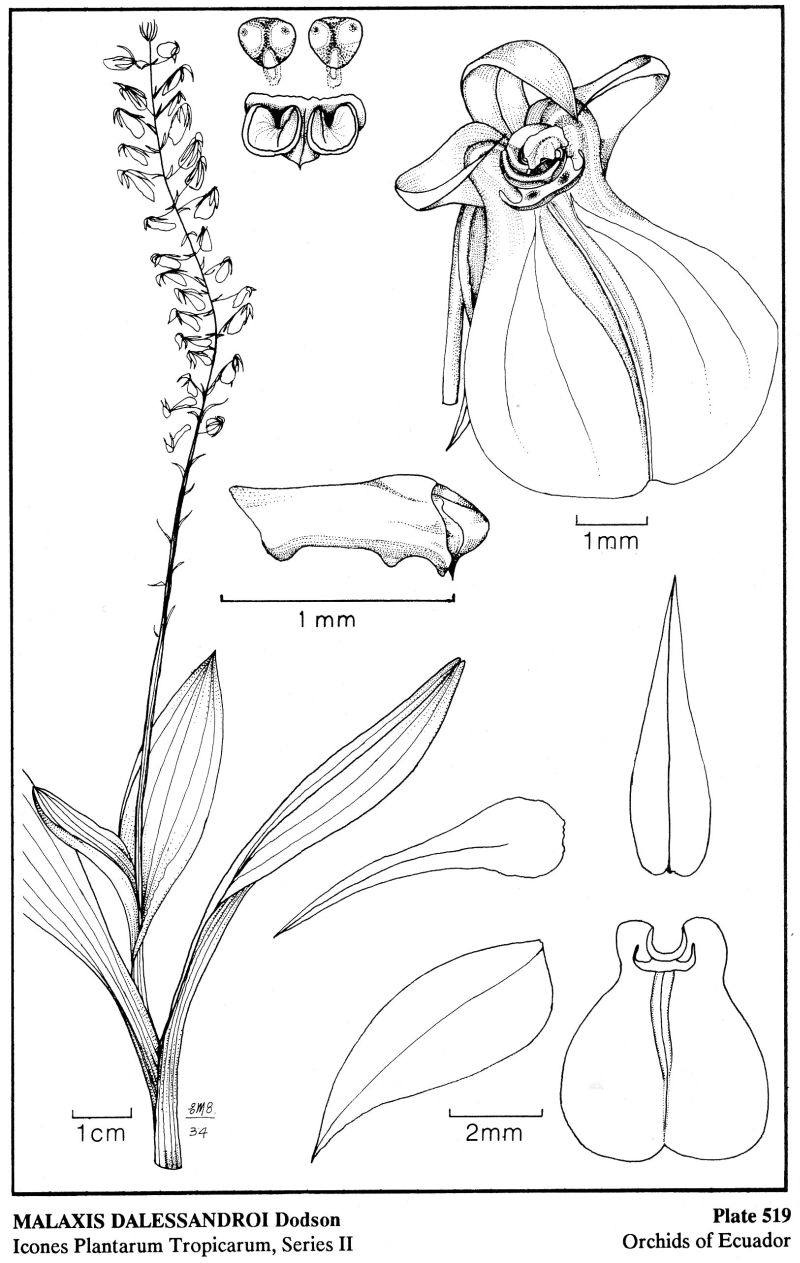 References W3 Tropicos, Kew Monocot list , IPNI ; Icones Plantarumm Tropicarum Plate 519 Dodson 1989 as Malaxis dalessandroi drawing fide; *Native Ecuadorian Orchids 1: 149 Dodson 1993 drawing fide; Flora of Ecuador 225 [2] Orchidaceae AA - Cyrtidiorchis Dodson & Luer 2005