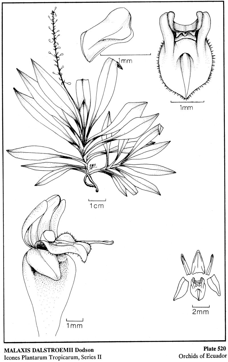 References W3 Tropicos, Kew Monocot list , IPNI ; Icones Plantarumm Tropicarum Plate 520 Dodson 1989 as Malaxis dalstroemii drawing fide; *Native Ecuadorian Orchids 1: 149 Dodson 1993 drawing fide; Rudolf Schlechter Die Orchideen Band 1C lieferung 42 - 43 pg 2626 - 2762 Brieger 2001 drawing fide; Flora of Ecuador 225 [2] Orchidaceae AA - Cyrtidiorchis Dodson & Luer 2005