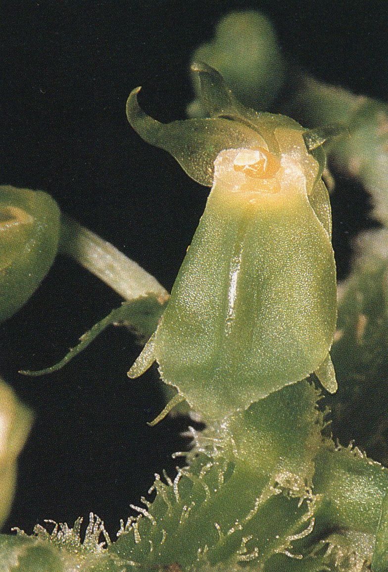 Found in Pichincha Ecuador at elevations around 1700 to 2400 meters as a small sized, cool to cold growing terrestrial with caulescent, recumbent to erect stems enveloped by imbricating, distichous leaf sheaths carrying membraneous, elliptic, acuminate, narrowing below into the long-petiolate base leaves that blooms in the summer and fall on a terminal, elongate, peduncle to 5.2" [13 cm] long, rachis to 12" [30 cm] long, recurved apically, spirally arranged, many flowered inflorescence with awl-shaped, entire margin floral bracts and carrying yellow green flowers.