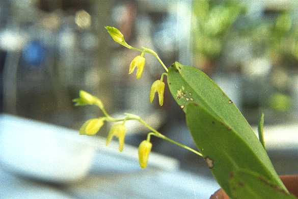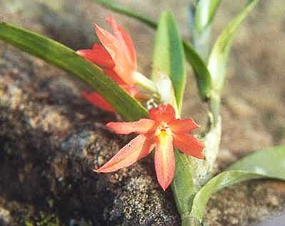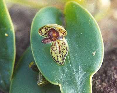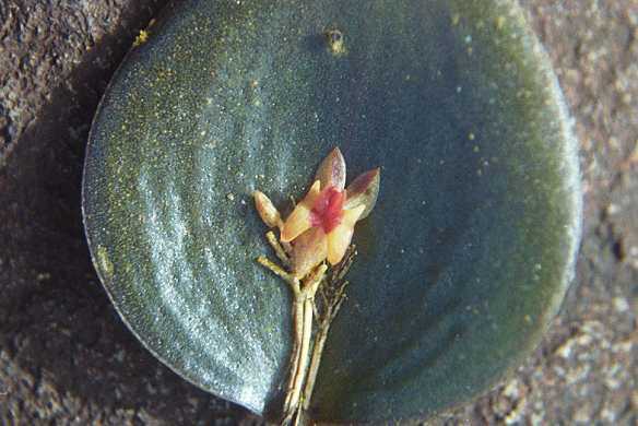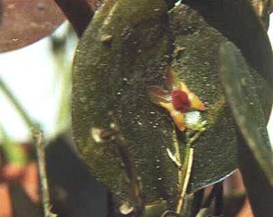 This one was found on small roadside fence trees at an elevation of 1500 meters in the Arenal Volcano area. It flowered for a few days in August and it has an outward appearance vegetatively of a Lepanthes yet the leaf is more folded [cordate]. Actual flower size is approx 1/4".