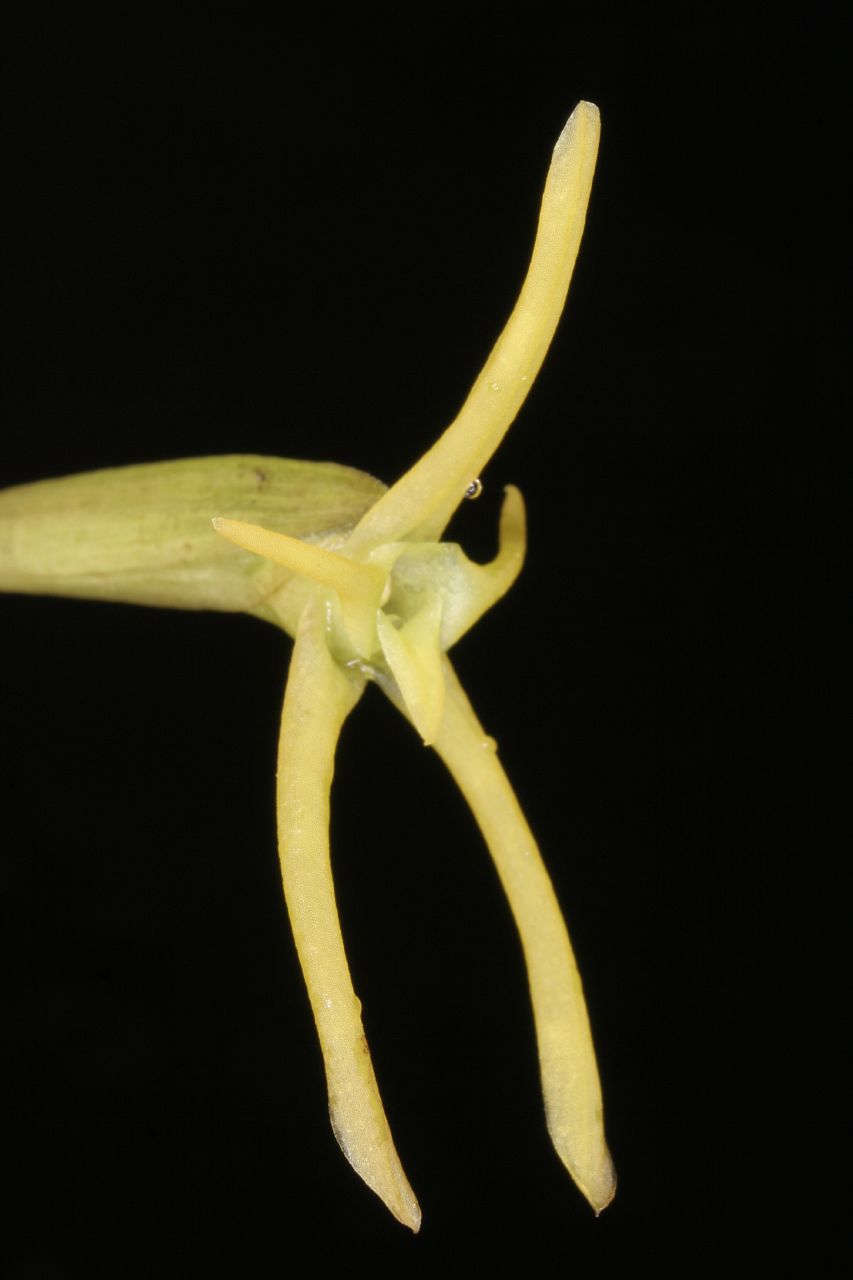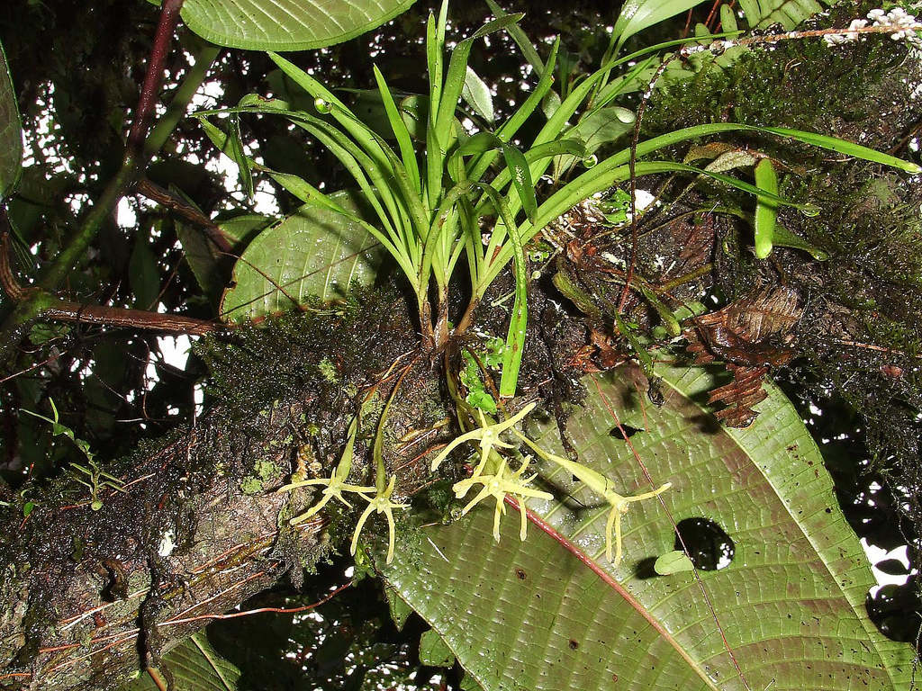 Found in Costa Rica, Panama, Colombia and Ecuador in cloud forests at elevations of 750 to 2000 meters as a small sized, warm to cool growing epiphyte with an erect, stout, rarely basally branched stems enveloped completely by leaf bearing sheaths each carrying distichous, narrowly elliptical, acute, conduplicate below, basally clasping leaves that blooms mostly in the late winter and early spring on a horizontal to ascending, from the base of the stem, to 4" [10 cm] long, single flowered inflorescence.