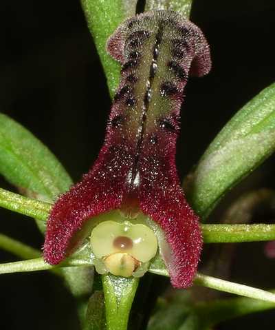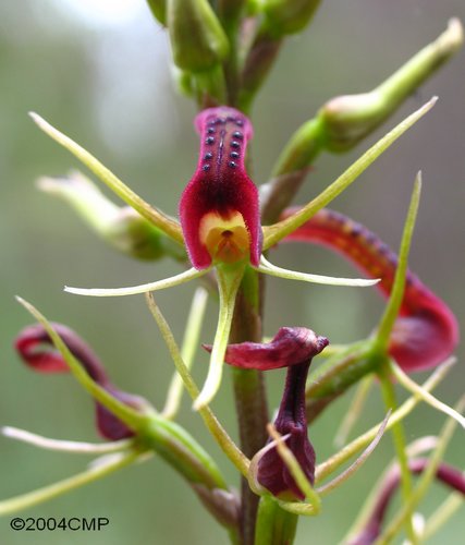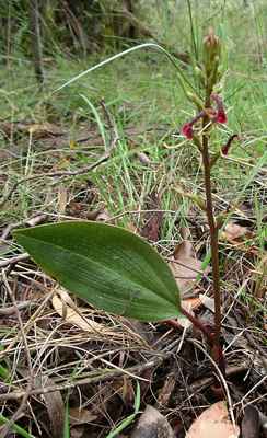 A medium sized, cool growing, terrestrial orchid without pseudobulbs from the eastern half of Victoria, Australia in the coastal to mountain areas in heathy forests, open forests, woodland and taller closed forests in well drained soils and has ovate, acute, narrowing into the petiolate base leaves that are pale green on top and deep red, purple or brown beneath, blooming in the spring and fall on an erect, slender, to 15" [37.5 cm] long, many [9 to 12] flowered raceme with successive opening, inverted flowers.