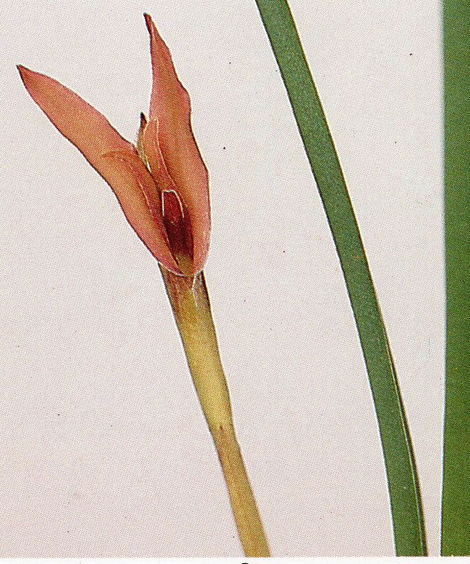 Found in Colombia and northern Ecuador at elevations around 1400 meters as a miniature sized, cool growing epiphyte with a monopodial, sometimes asally branching stem enveloped by numerous, imbricating, distichous leaf sheaths carrying narrowly linear, abruptly obtuse leaves that blooms in the late spring on numerous, lateral, basal, spreading, peduncle filiform,1 to 2 close, tubular bracted, 2.2" [5.5 cm] long, single flowered inflorescence with a large, inflated, floral bract and with a 3 winged ovary unique to the genus.