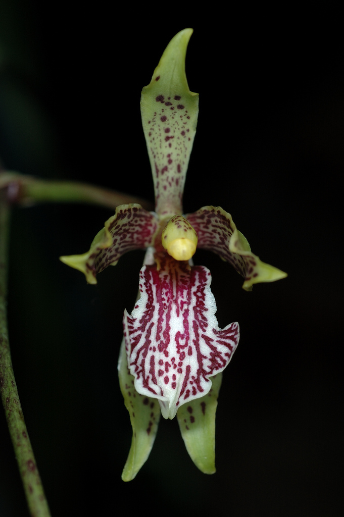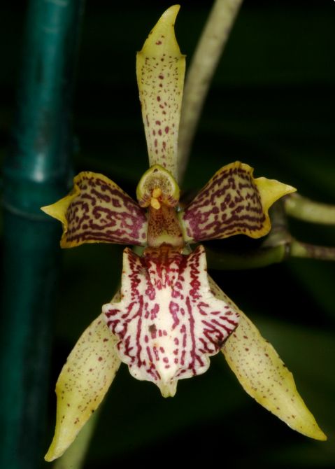 This epiphytc species is found in northern Bolivia in cloud forests at elevations around 2000 to 2500 meters as a small sized, cold growing epiphyte with a short, repent rhizome giving rise to obclavate pseudobulbs enveloped basally by 8 to 10, distchous, articulate, basally conduplicate, foliaecous above sheaths and carrying 2, apical, erect, loriform, conduplicate below into the petiolate base leaves that blooms in the winter on 1 to 2, axillary, erect, 80" [200 cm] long overall, peduncle with 2 to 3, adpressed, triagular bracts, paniculate, green with dark purple spots, short branched, divaricate, each 2 to 4 flowered, many flowered inflorescence with triangular floral bracts.