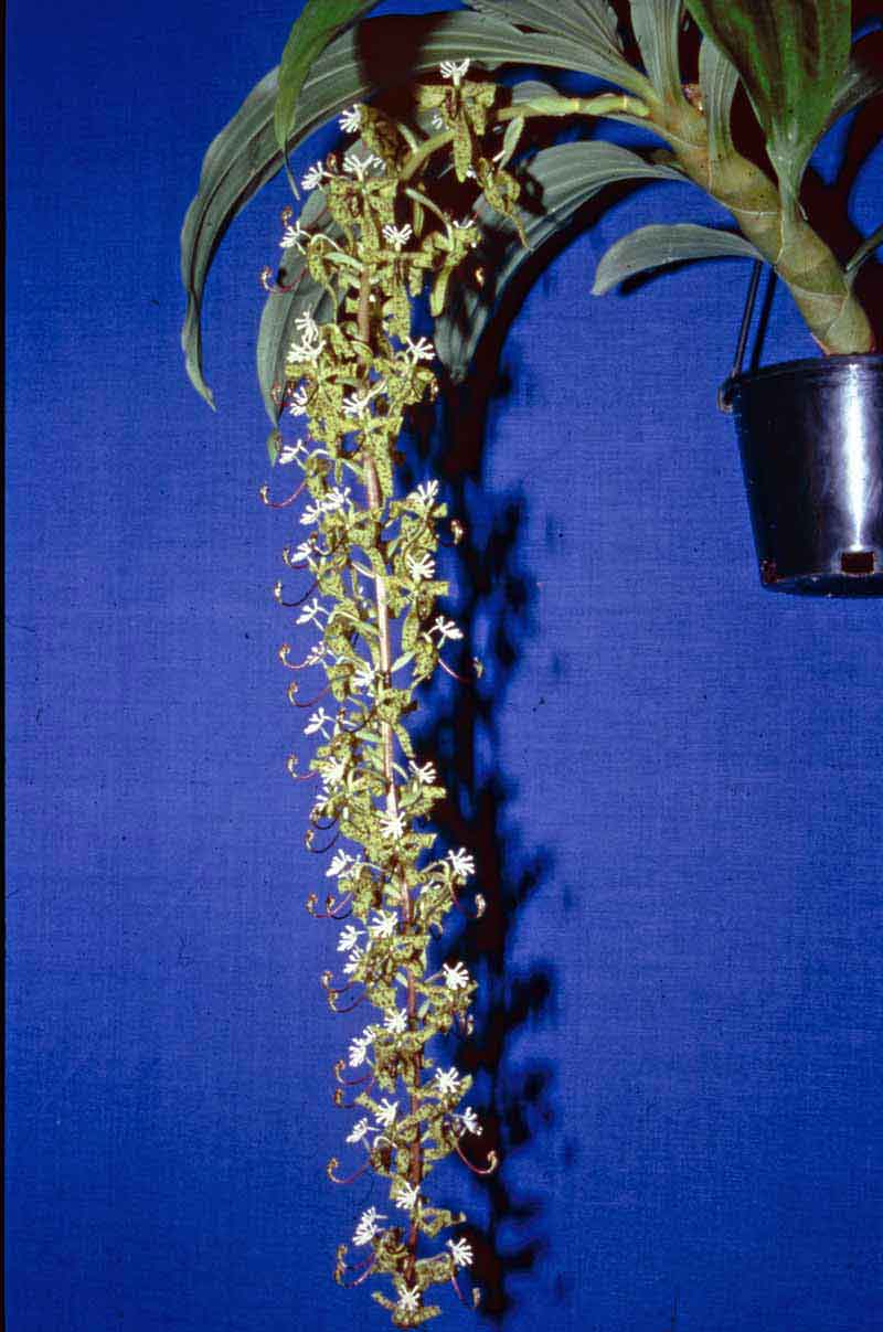 Found in Peru in wet montane forests at elevations of 1400 meters as a small to medium sized, cool growing epiphyte with cyclindric-fusiform pseudobulbs carrying numerous, oblong-lanceolate, acuminate, thin-textured, plicate, basally clasping leaves that blooms in the later spring on 1 to 3, arching-pendant, to 24" [to 60 cm] long, many flowered inflorescence carrying non-resupinate flowers