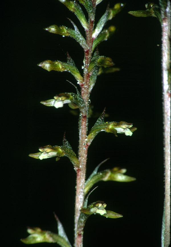 Distinguished by the densely many flowered inflorescence, the elliptic to ovate, green, basally rounded leaves, the obtuse, 3 lobed lip and the lip margins that are not thickened.