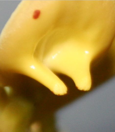 This species is most similar to C haagii but differs mostly in the proportionally longer floral bracts and the much larger and longer pincer-like horns at the base of the lip and have more densely spotted flowers.