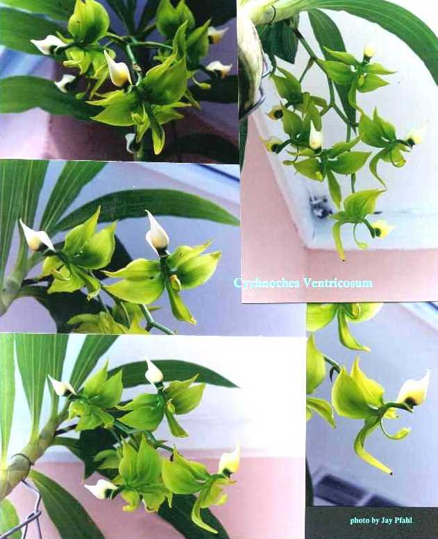 SUBFAMILY Epidendroideae TRIBE Cymbidieae SUBTRIBE Catasetinae Cychnoches is a genus with 23 species spread throughout most of tropical America. This genus as a whole has long slender pseudobulbs with several internodes that have thin, veined deciduous leaves with an inflorescence that starts from the apical nodes and gives rise to unisexual flowers with both sexes sometimes on the same spike but not hermaphroditic flowers. Many more male flowers are produced than female with the main diference being that the male flowers have a longer column with a spring loaded pollina that can be ejected onto a pollinator. The 2 hard, round pollina are connected to an elongated stipe that is in turn connected to a round viscidium. They are lowland epiphytes found from sea level to 600m in humid to moist forests or terrestrials on fallen rotten logs. They like warm conditions as a whole and heavy fertilizer and water after the new lead is 2-3 " tall through it's flowering in the fall, then no water or fertilizer until the lead shows again in the spring. Many growers actually take the plant out of the pot and cut away all the roots and 2 year old bulbs and then place the naked pseudobulb in a dry lighted area until the new growth is visible. It is then potted up and the new lead is allowed to grow to 2-3" before application of water and fertilizer.