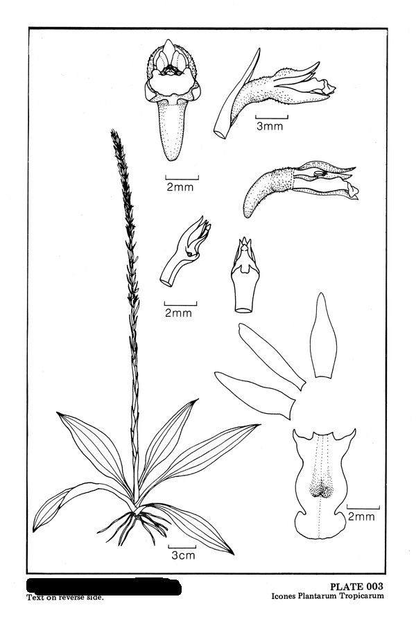 Found in Manabi Ecuador in the low cloud forests of the coastal mountains of western Ecuador at elevations around 500 to 600 meters as a medium sized, warm growing growing terrestrial with a basal rosette of elliptic, acute, cuneate below intothe petiolate base leaves that blooms in the late winter on a terminal, erect, alomst completely enveloped by appressed, ovate, acuminate sheaths which decrease in size up the stem, to 12" [30 cm] long, densely many flowered inflorescence with longer han the flowers floral bracts.
