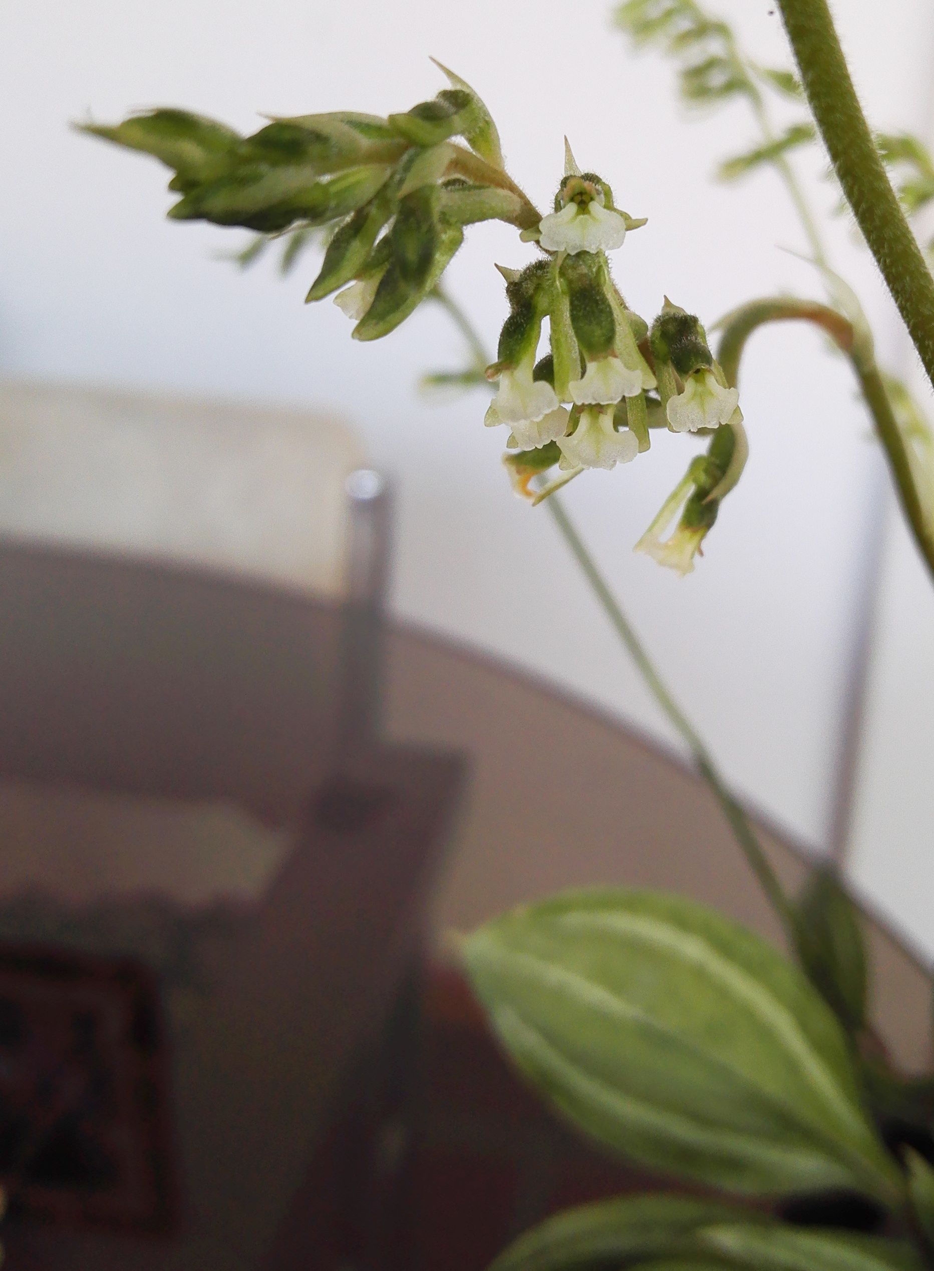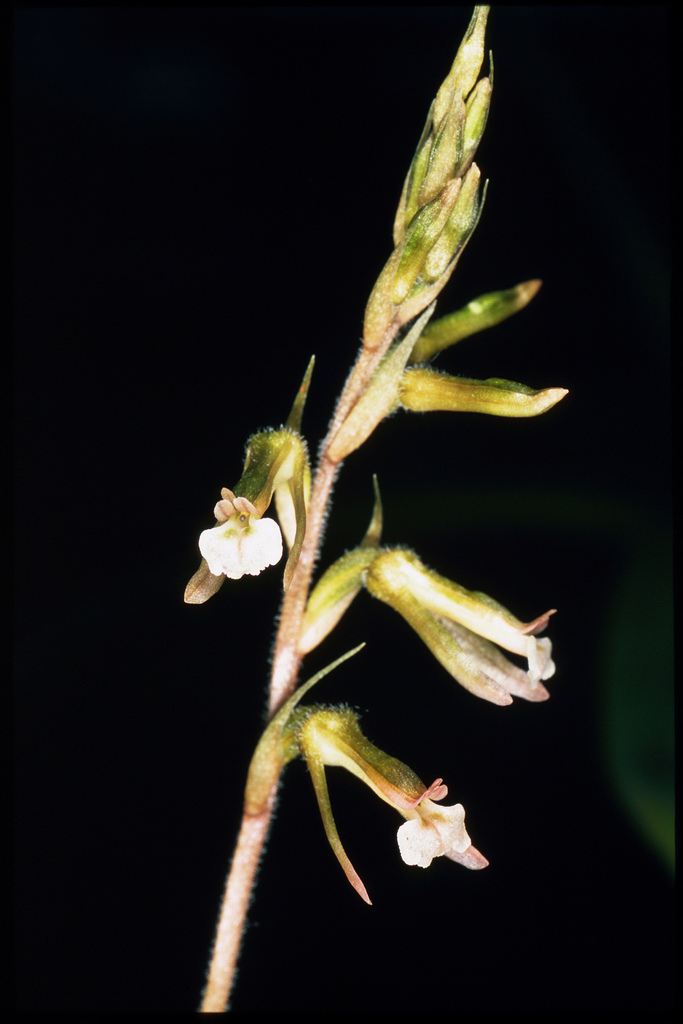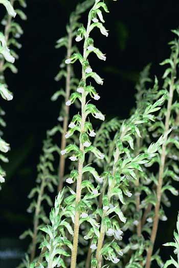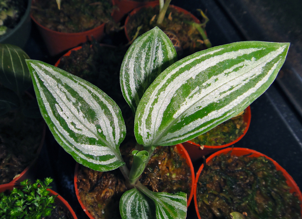 Found in Venezuela, Colombia, Ecuador and Peru as a miniature sized, warm to cool growing, terrestrial at elevations around 450 to 1600 meters in evenly moist, dense to slightly open forests with spathulate, variegated dark green and white, petiolate leaf that is cuneate into the basal petiole blooming in the late winter to early spring on a terminal, erect, thin, pale rose to greenish, 10 to 12" [25 to 30 cm] long, many [70] flowered, racemose inflorescence with several, acuminate bracts and acuminate floral bracts enveloping the ovaries with the flowers densely clustered and spiralling towards the apex.