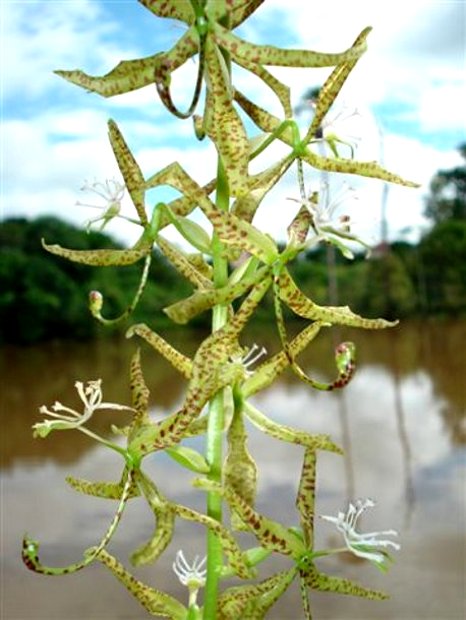Found in Para state of Brazil in rain forests at elevations of 600 to 800 meters as a medium sized, warm growing epiphyte with cylindrical-elongate, erect, multi-noded pseudobulbs completely enveloped in youth by deciduous sheaths and carrying several, oblong-lanceolate, undulate margin, curved, plicate, acuminate leaves that blooms in the spring on an axillary, arched, 10 to 14" [25 to 35 cm] long, to 30 flowered inflorescence covered by lanceolate bracts and carrying male, non-resupinate flowers.
