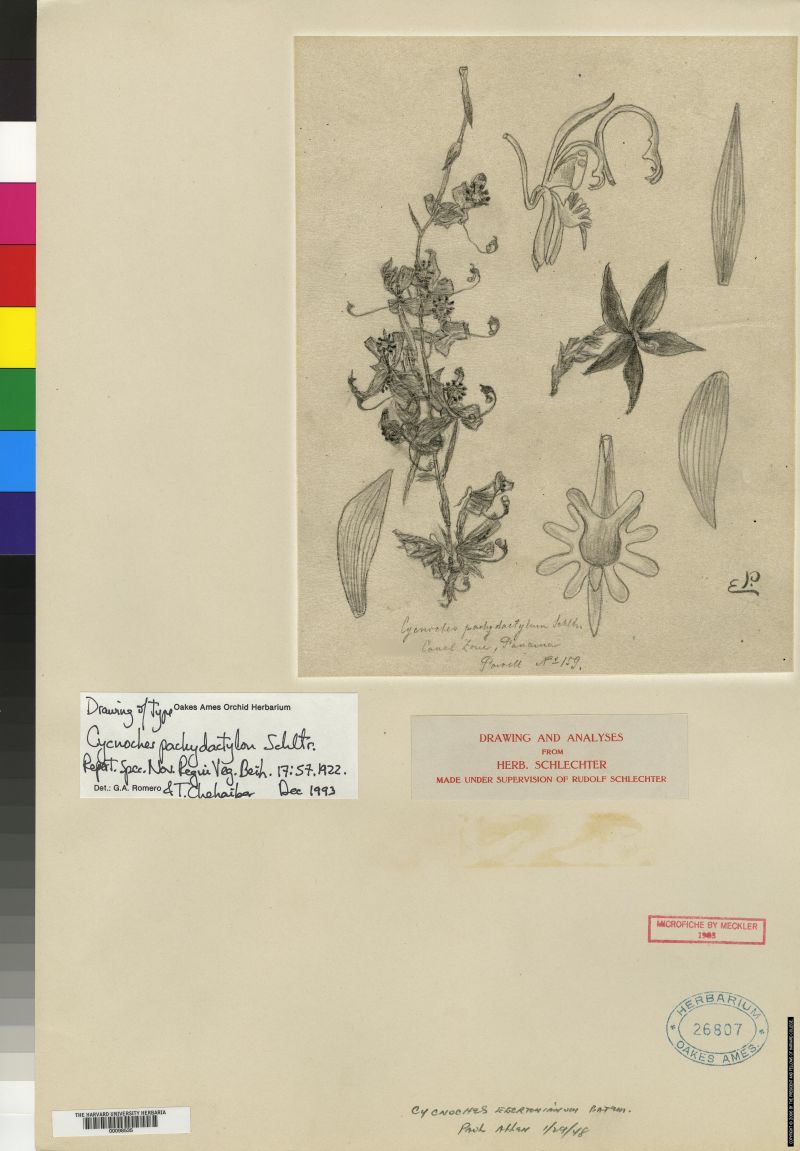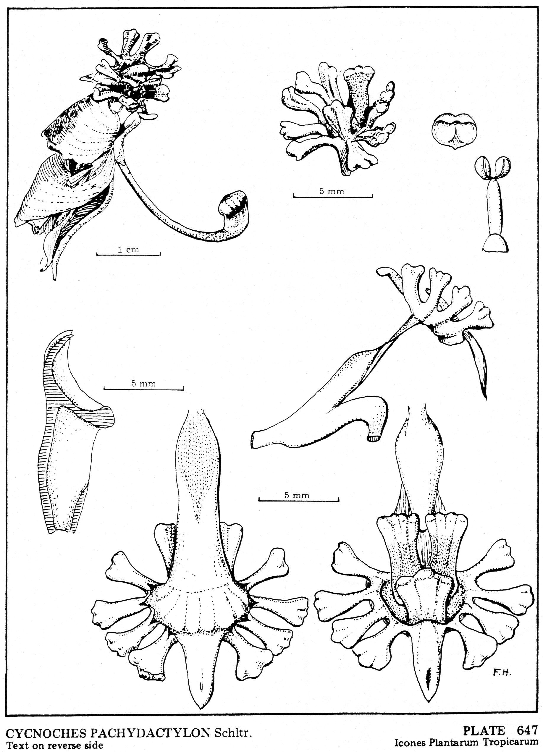 References W3 Tropicos, Kew Monocot list , IPNI ; *Repert. Sp. Nov. Regni. Veg. Beih. 17: 57. Panama Schlechter 1922; Flora Brasilica Vol XII VI 97 - 114 Hoehne 1942; Icones Plantarum Tropicarum Plate 647 Hamer 1982 drawing fide; Selbyana Vol 10 Orchids of Central America Hamer 1988 drawing fide; Rudolf Schlechter Die Orchideen Band 1B lieferung 26 1584 - 1648 Brieger 1992; Field Guide to the Orchids of Costa Rica and Panama Dressler 1993; Vanishing Beauty; Native Costa Rican Orchids Vol 1 Pupulin 2005 as Cycnoches pachydactylon photo good;