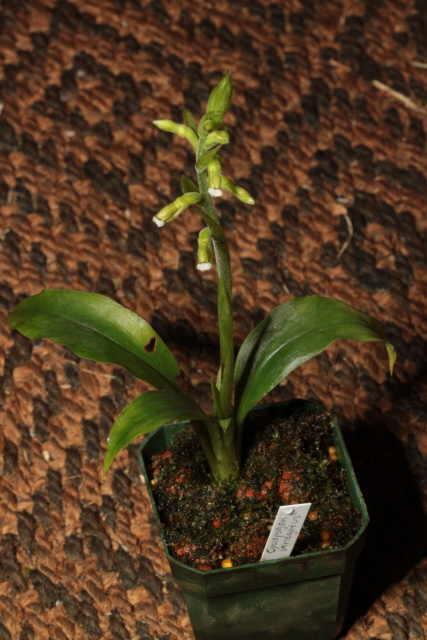 Found in Districto Federal area of Brazil at elevations around 1400 meters as a small to medium sized, cool growing terrestrial orchid with a basal rosette of 3 to 4, ovate, obtuse, gradually narrowing below into the elongate, petiolate base leaves that blooms in the winter on a terminal, erect, 8 to 10" [20 to 25 cm] long, several flowered inflorescence with spaced, lanceolate, acute bracts and shorter than the ovary floral bracts.