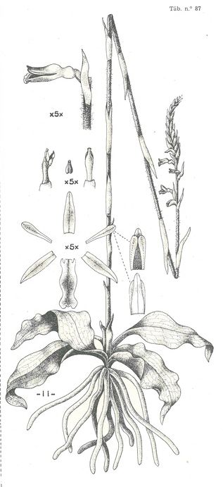 Found in Minas Gerais and Sao Paulo states of Brazil as a medium sized, warm to cool growing terrestrial with 4 to 6, basal, in a rosette, thinly membraneous, 7 delicately nerved, green above, white spottedf beneath, ovate, acute, somewhat rounded below intot he short, pesudopetiolate base leaves that blooms on a terminal, erect, to 16" [40 cm] long overall, peduncle with 7 to 8 adpressed, triangular-lanceolate, acute bracts, rachis short to 2 to 2.4" [5 to 6 cm] long, 15 to 20 flowered inflorescence with linear-lanceolate, acuminate, single nerved floral bracts and carrying small, erect-patent flowers.