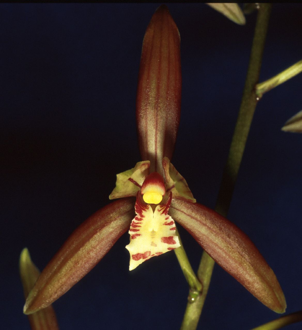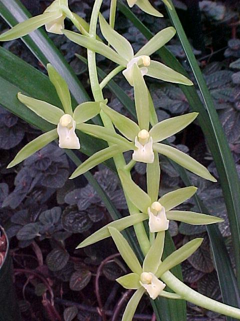 This is a Chinese and northern Vietnam, miniature sized, warm to cold growing terrestrial occuring in lowland forests in rich humus in damp crevasses or in soils dampened by mists and splash along steep watercourses that is a and has ovoid pseudobulbs carrying narrow-linear, glossy leaves and blooms with a basal, erect, 2' 10" [to 80 cm] long, many [20] flowered, racemose inflorescence with overlapping sheaths and fragrant light sweet floral scented flowers held well above the leaves occuring in the fall through spring.