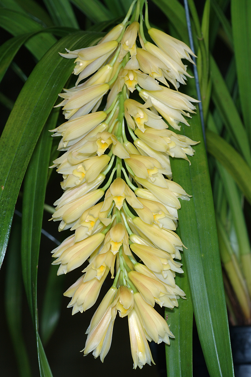Found in the Chinese Himalayas, Assam India, eastern Himalayas, Nepal, Bhutan, Sikkim and Myanmar on trees and rocks overhanging streams in shady locations at elevations of 1500 to 2800 meters as a large sized, cool to cold growing epiphyte or lithophyte with ovoid, bilaterally compressed pseudobulbs and carrying narrowly linear-elliptic, acute, hooded and unequally bilobed apically leaves articulated 1.6 to 4.8" [4 to 12 cm] from the pseudobulb that blooms on an arching to pendant, slender, to 2' [60 cm] long, racemose, densely many flowered [20 to 35] inflorescence with slightly scented, close set flowers that do not open well, arising from the lower leaf axils occuring in the fall to early winter.