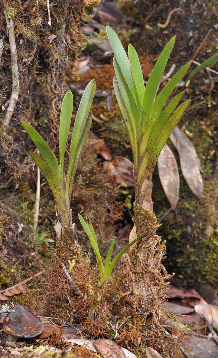 Found in Borneo [Sabah, Sarawak] near Mount Kinabalu at elevations of 1200 to 2300 meters in marshy areas of open scrubby montane woodlands as a medium to giant sized, cool to cold growing, monopodial, scrambling terrestrial orchid with a simple, elongate, erect to reclining stem enveloped completely by persistent, leaf-less to leaf-bearing sheaths with the lowermost being fiberous and the uppermost carrying, 4 to 8, distichous, broadly linear, ensiform to ligulate, conduplicate, gently curving, obtuse, mucronate, coriaceous, articulated to the leaf sheaths leaves that blooms in the spring and fall in situ on an axillary, lax, 1 to 4 flowered, racemose inflorescence enveloped by 6, narrowly elliptic, acute to acuminate, scarious, basal bracts both concealed within the conduplicate leaf blade and has ovate to triangular-ovate, acute, scarious floral bracts and carries slightly fragrant flowers.