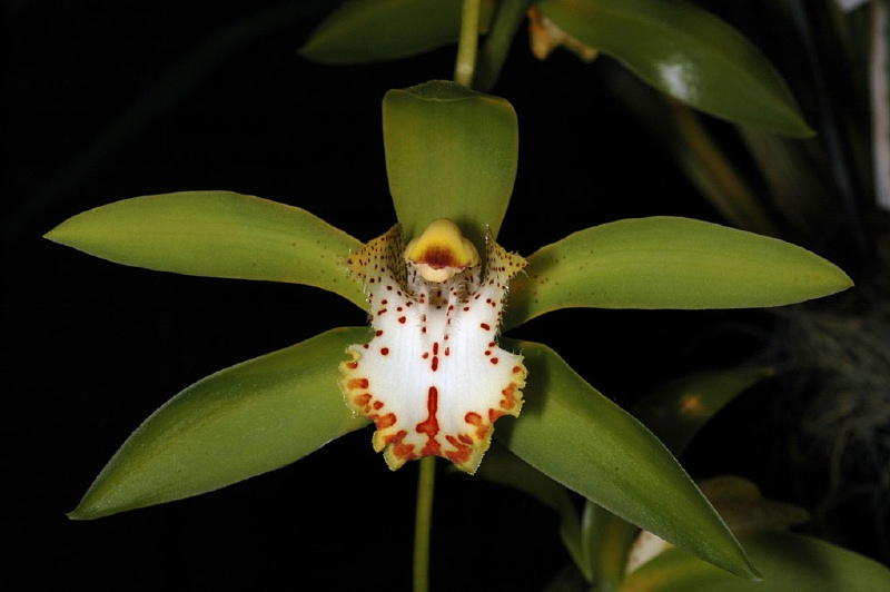 Found in Nepal, Bhutan and Sikkim on steep banks in dense, damp forests or evergreen-oak forests often where thick moss occurs at elevations of 1500 to 2600 meters as a medium to large sized, cold to cool growing epiphyte or lithophyte with ovoid, elongate, bilaterally flattened pseudobulbs carrying linear-elliptic, acute, leaves that are articulate 1.6 to 4" [4 to 10 cm] from the pseudobulb that blooms in the late winter and early spring on a very stout, sheathed below, arching to pendant, slightly flattened, to 2 1/2' [75 cm] long, apically racemose inflorescence with triangular floral bracts and carrying 6 to 15, mostly nodding, extremely fragrant, long-lasting flowers.
