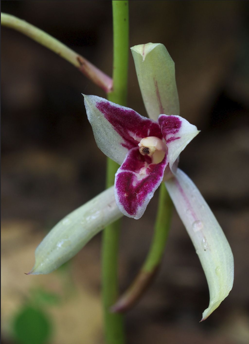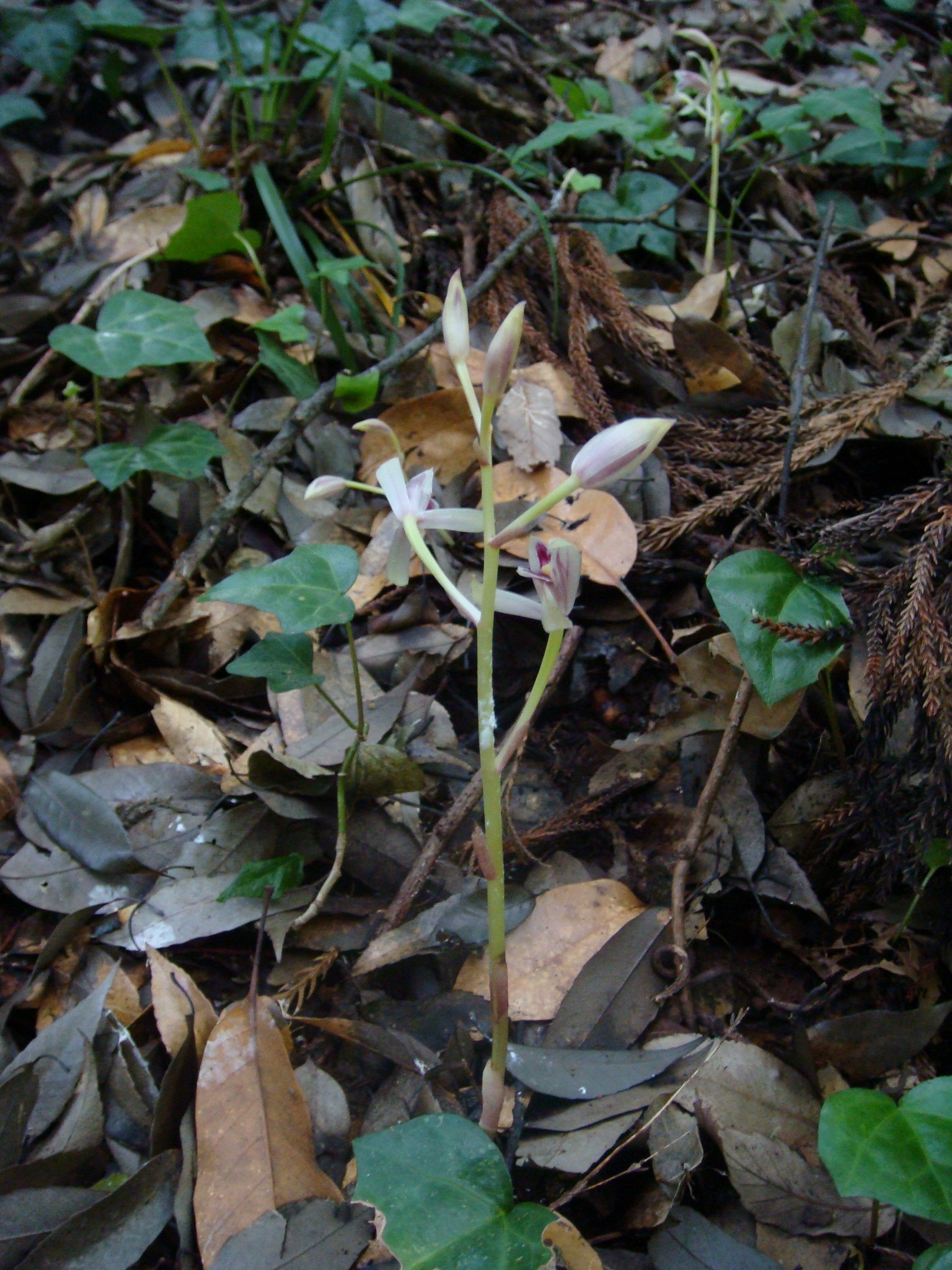 Found in Pakistan, the western Himalayas, the Chinese Himalayas, Assam, the eastern Himalayas, Nepal, Bhutan, Myanmar, Thailand, Laos, Vietnam, Taiwan, the Ryukyu Islands and Korea in forests along rivers, in forest margins and on open grassy slopes at elevations of 700 to 1500 meters as a miniature to just medium sized, warm to cool growing, leafless terrestrial with a subterranean, branching, soft, fleshy, tuberculate rhizome giving rise in the spring and summer on a terminal, from the end of the rhizome, erect, 3 to 6 flowered inflorescence enveloped basally by 4 to 8, imbricating, boat-shaped, ovate bracts and oblong-lanceolate, acute floral bracts