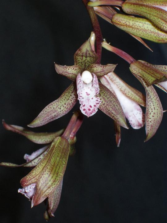 Found in Sikkim in evergreen forests at elevations of 1500 to 2000 meters as a small sized, cool growing epiphyte with narrowly ovoid, lightly bilaterally compressed pseudobulbs carrying 12 to 14, distichous, narrowly oblong, arching, tapering to an acute unequal apex, jointed leaves articulated 1.2 to 6" [3 to 15 cm] from the pseudobulb to the broad leaf base that blooms in the fall on an arching then pendant, 4.6" [14 cm] long, 10 to 12 flowered, racemose, purple inflorescence with boat-shaped, inflated sheaths and triangular floral bracts carrying suberect to campanulate flowers.